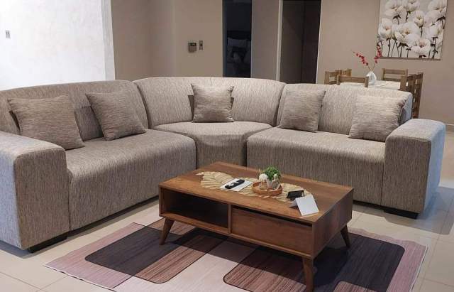 Cozy en-suite open plan living room with a corner piece couch, smart TV with pre-installed entertainment APPs, dining area and fully equipped kitchen.